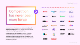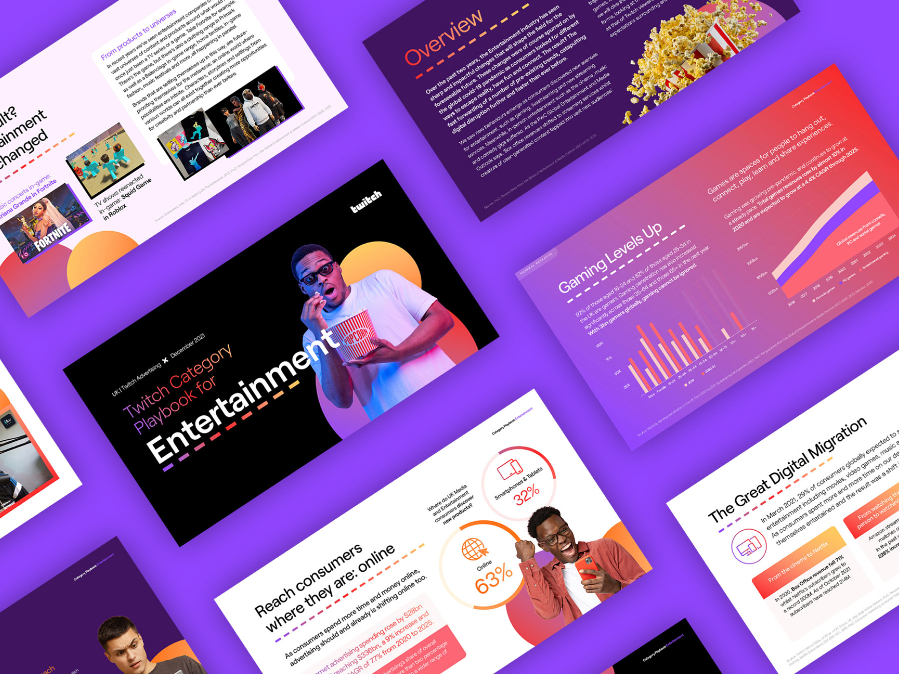 Created in the Twitch brand style, the Playbooks outline general market insights highlighting Twitch’s understanding of the market, a research deep dive based on the results of the OnePoll research and case studies and conclusions relevant to that industry. They are designed and supplied in PDF and PowerPoint formats for ease of presenting and sharing.